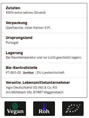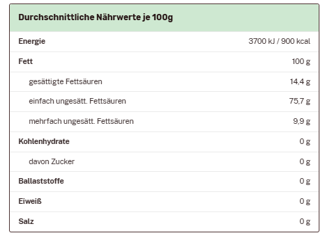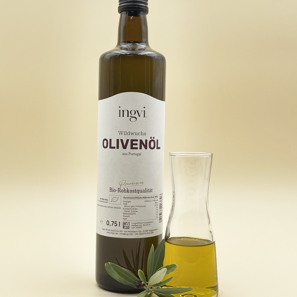 Für meine Speisen verwende ich ausschließlich kostbares Olivenöl in Rohkostqualität. Es ist reich an Polyphenolen, Vitamin E sowie anderen sekundären Pflanzenstoffen und ist somit ein Schatz für unsere Gesundheit. Nicht umsonst wurde es einst das "flüssige Gold" genannt.