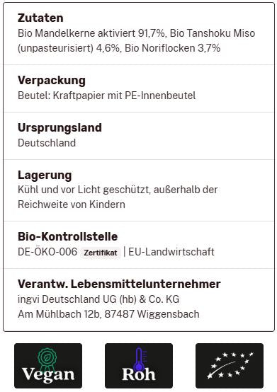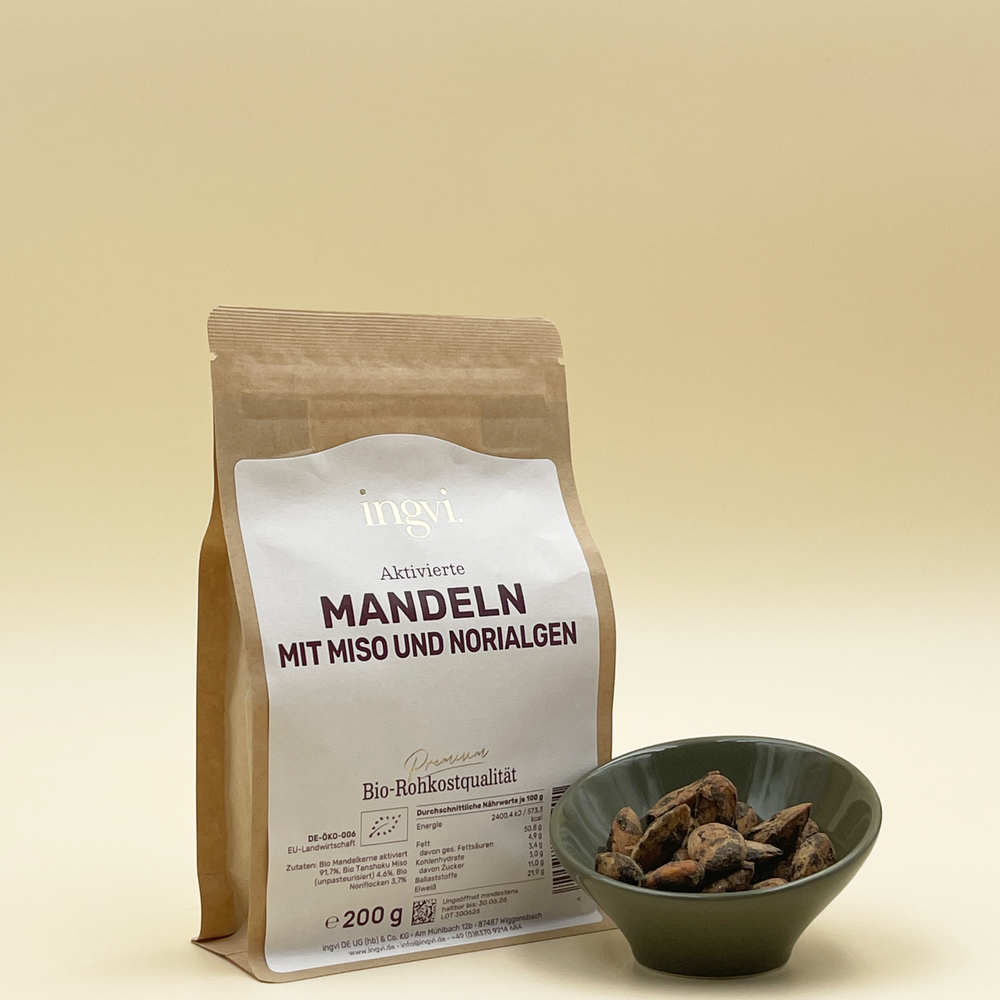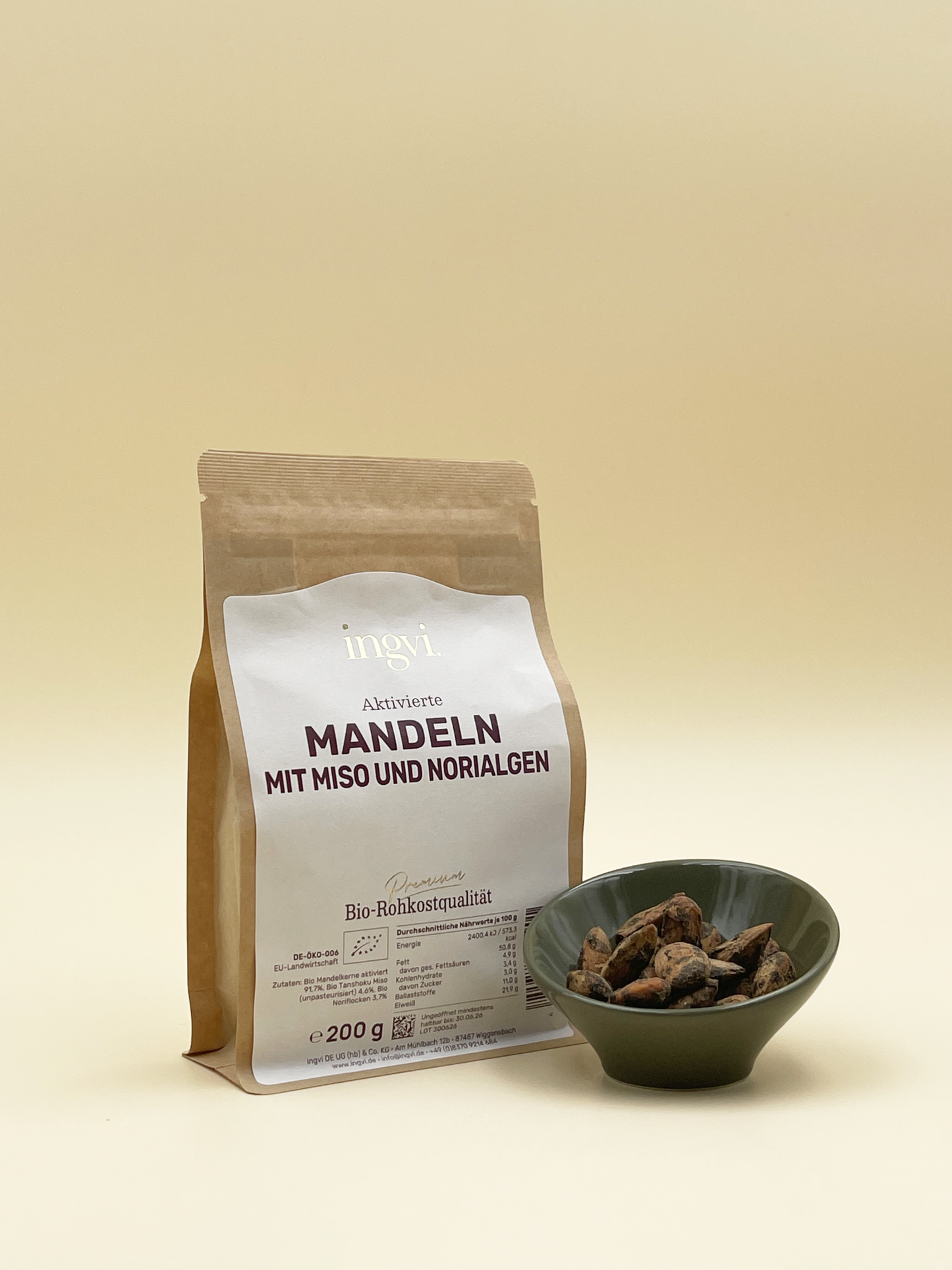 Aktivierte Mandeln mit Miso und Norialgen, ingvi, Rohkostqualität, Bio, 200 g zum Warenkorb hinzufügen