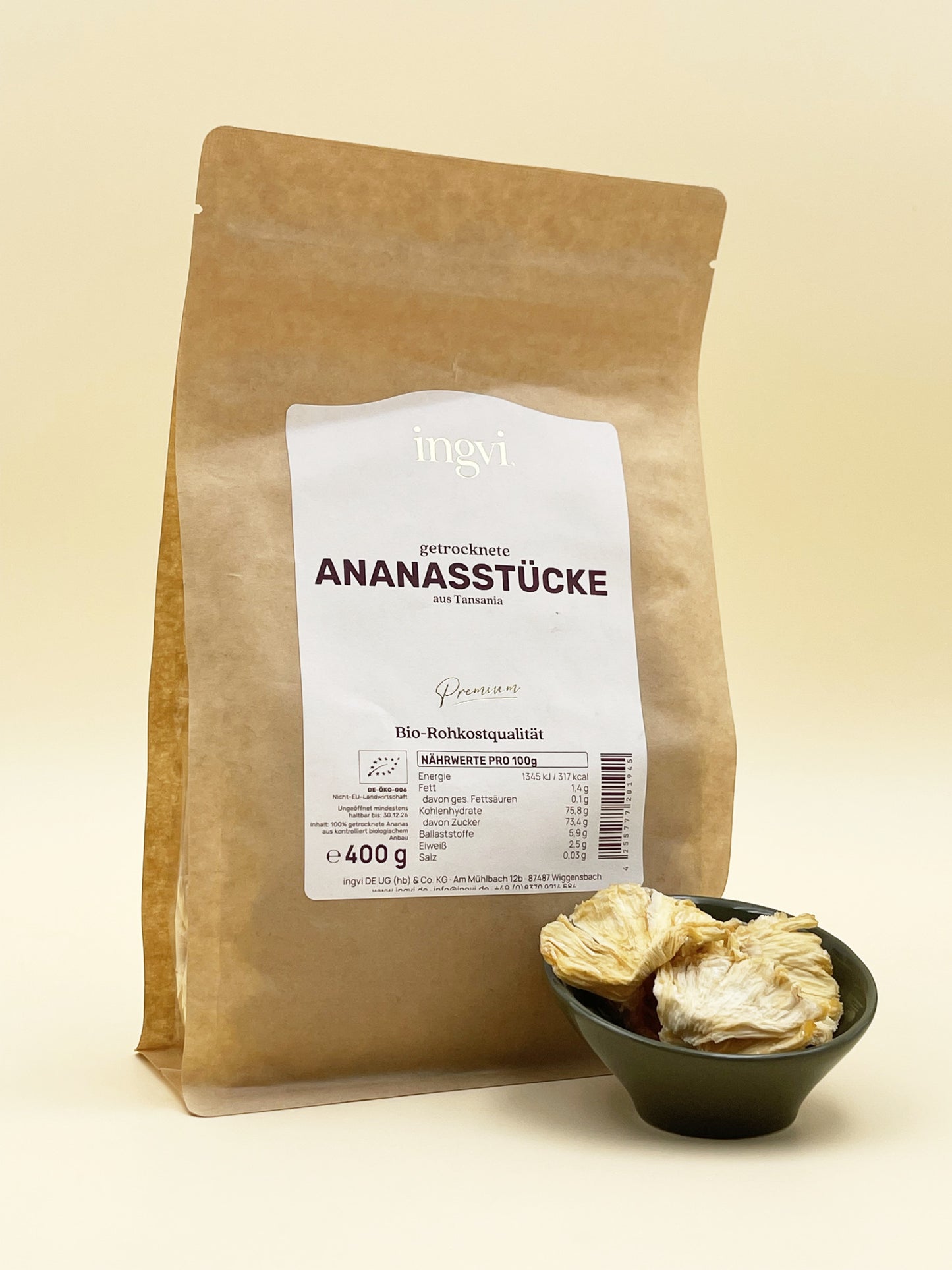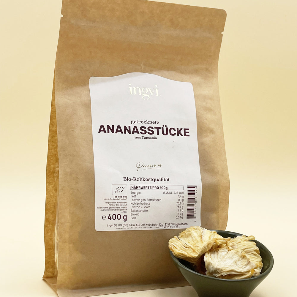 Ananasstücke getrocknet, Rohkostqualität, Bio 400g, ingvi zum Warenkorb hinzufügen
