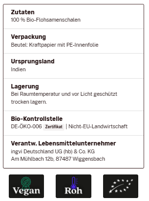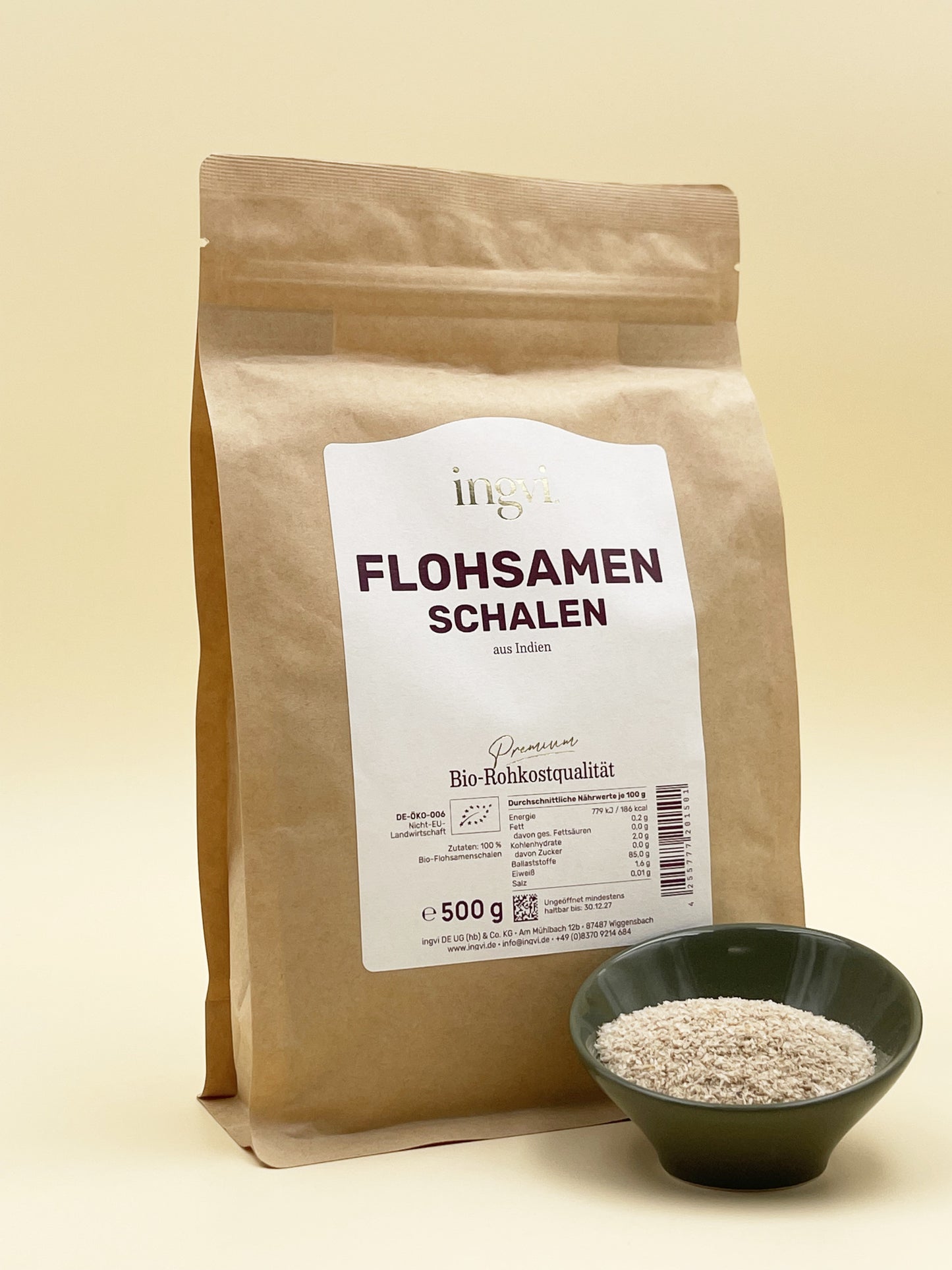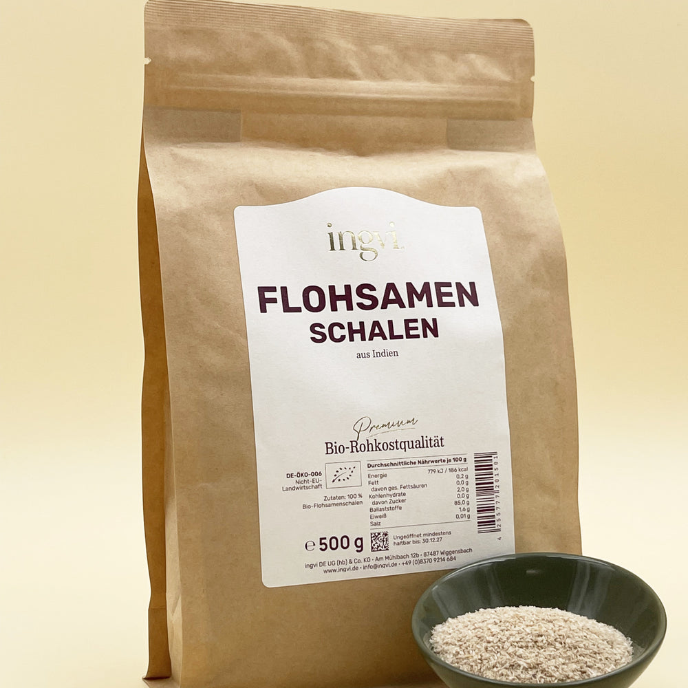 Flohsamenschalen, ingvi, Rohkostqualität, Bio 500g zum Warenkorb hinzufügen