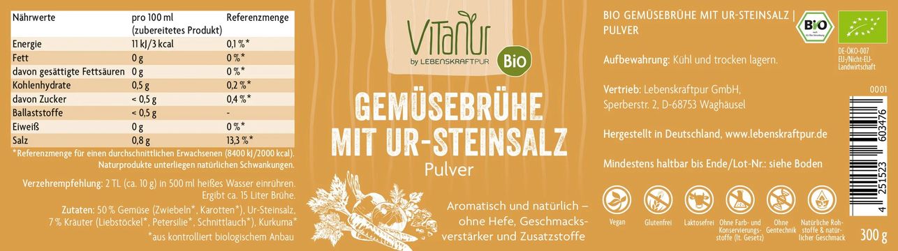 Gemüsebrühe, Vitanur, 300g ohne Hefe und ohne Sonnenblumenöl zum Warenkorb hinzufügen