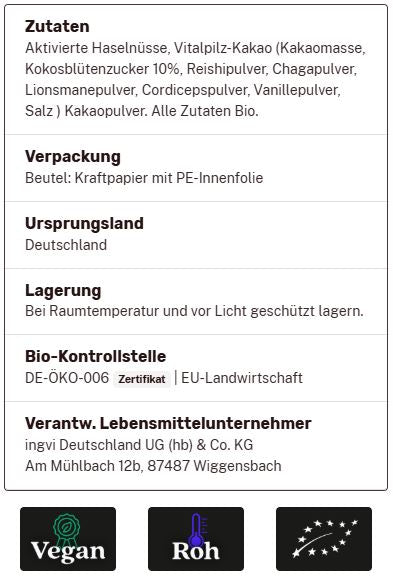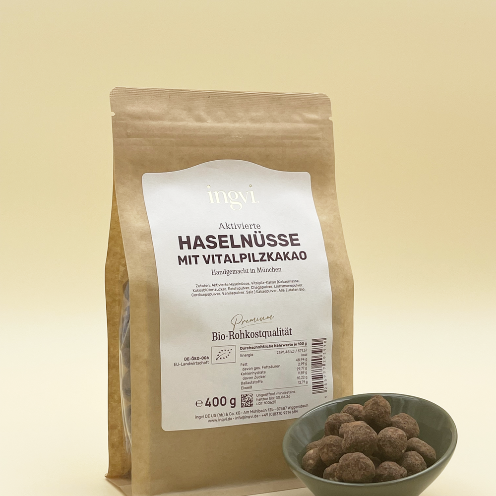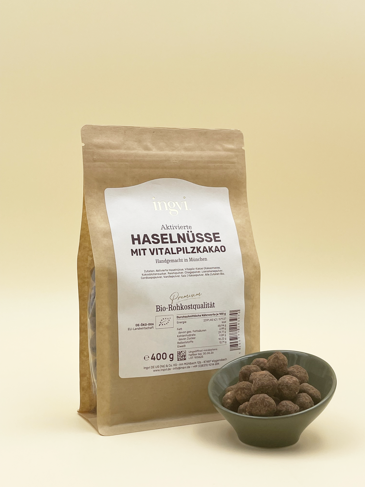 Haselnüsse aktiviert mit Vitalpilzkakao, ingvi, Rohkostqualität, Bio, 400 g zum Warenkorb hinzufügen