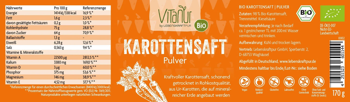 Karottensaft Pulver, Bio, höchste Qualitätsstufe, Vitanur, 170g zum Warenkorb hinzufügen