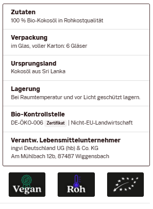 Kokosöl, ingvi, Rohkostqualität, Bio, 500ml, zum Warenkorb hinzufügen