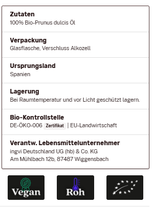 Mandelöl, 1. Kaltpressung, mit Gelpumpe, Bio, 50ml, ingvi zum Warenkorb hinzufügen