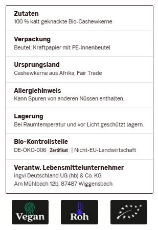 Cashewkerne, ingvi, Rohkostqualität, Bio zum Warenkorb hinzufügen