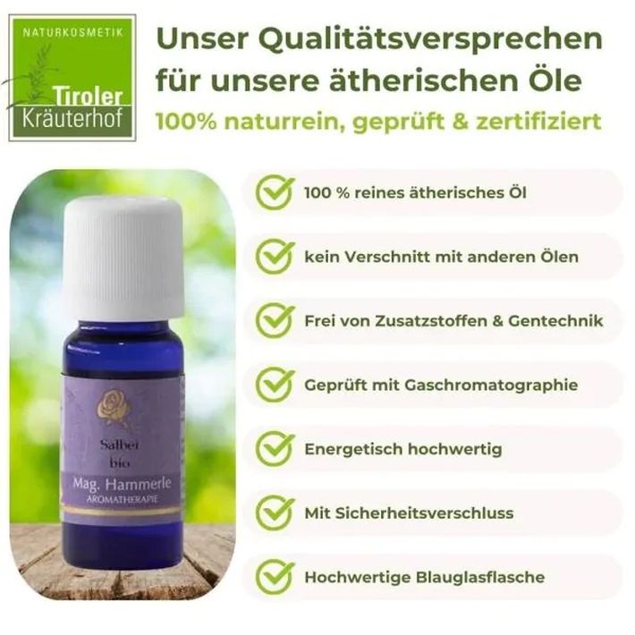 Seit alters her bekannt ist die raumluftreinigende Wirkung von Salbei, entweder als Räucherung oder auch als ätherisches Öl. Dank seiner Eigenschaften ist das ätherische Salbeiöl aber auch ein ideales Hilfsmittel zur Luftreinigung im Aromavernebler in Erkältungszeiten. Aufgrund des hohen Monoterpenketongehalts wird Salbei allerdings nicht innerlich eingenommen, sondern nur äußerlich oder im Aromavernebler in geringer Dosierung verwendet. Salbeiöl wirkt aufrichtend, erfrischend und belebend und kommt auch in Gurgellösungen für die Mundpflege gern zum Einsatz.