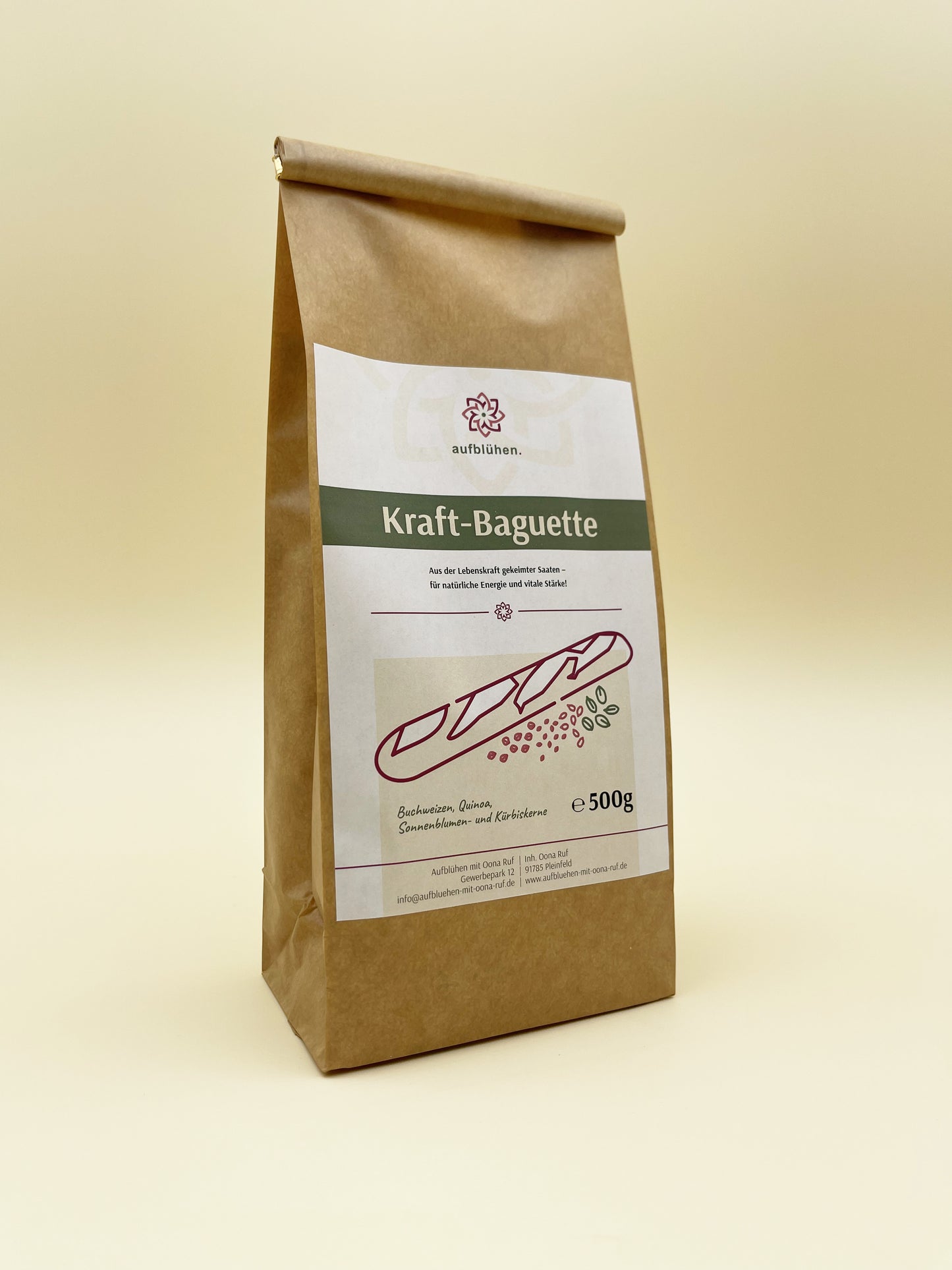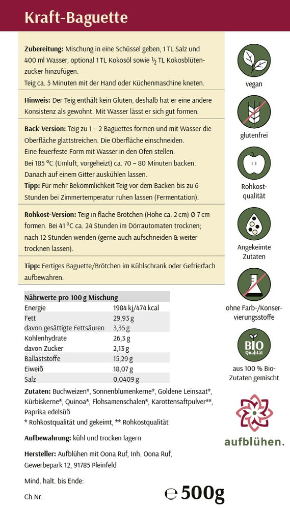 Kraft-Baguette, gekeimte Fertigmischung, Rohkostqualität, 100% Bio-Zutaten, 500g zum Warenkorb hinzufügen