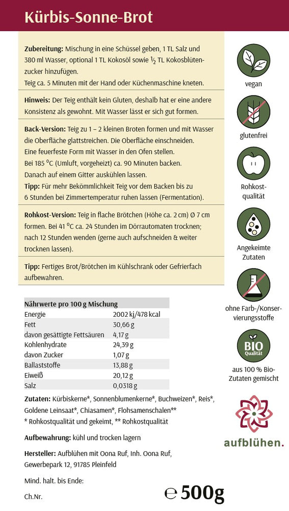 Kürbis-Sonne-Brot, gekeimte Fertigmischung, Rohkostqualität, 100% Bio-Zutaten, 500g zum Warenkorb hinzufügen