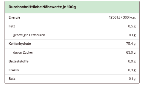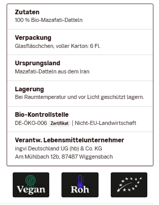 Es ist wichtig, Dattelsirup in Rohkostqualität zu verwenden, dieser soll sogar basisch sein und ist gesund, da er nicht - wie ein erhitzter Sirup - Vitalstoffverluste durch das Erhitzen hinnehmen muss. Die meisten Dattelsirupe sind gekocht und damit erhitzt. Unser Dattelsirup wird ohne Wasserzugabe aus der frischen, entsteinten Mazafatidattel gepresst.